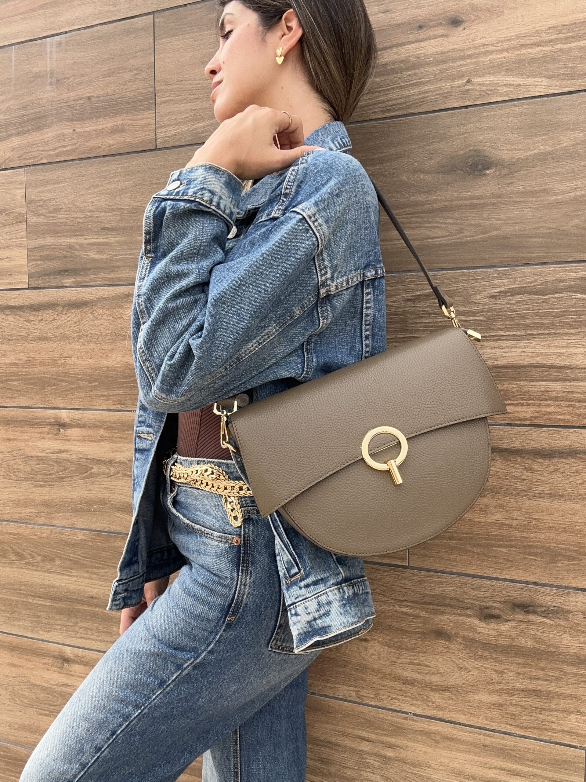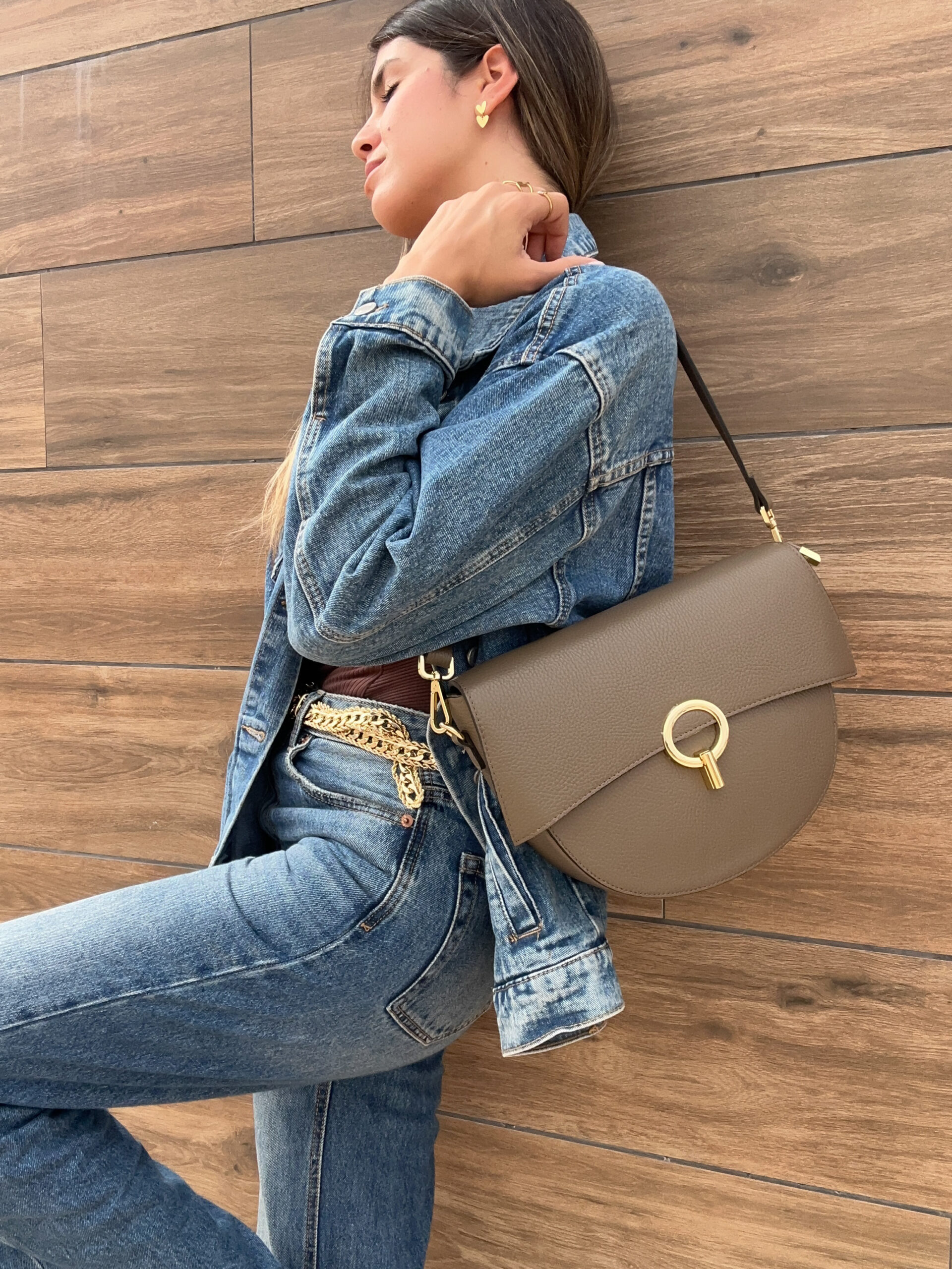 El bolso más bonito de toda la colección »Piel». Elaborado en piel de excelente calidad, destaca por su diseño curvado de líneas limpias. Su cierre dorado frontal aporta un toque de sofisticación y exclusividad. Incluye un asa removible para llevarlo al hombro o como bolso de mano; conservando su forma y elegancia original. Un diseño atemporal que eleva cualquier look con estilo y distinción.